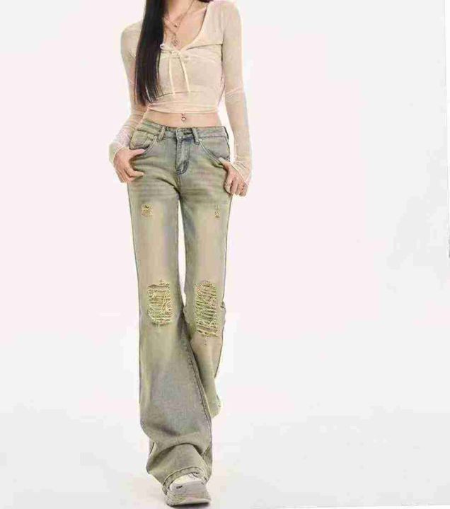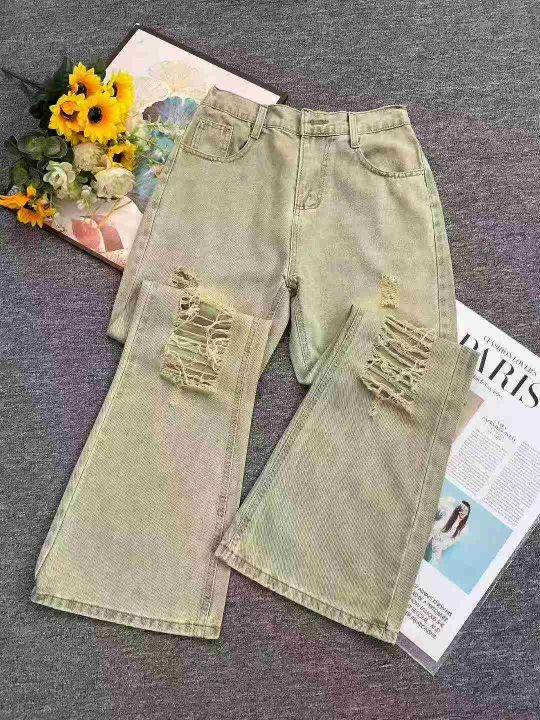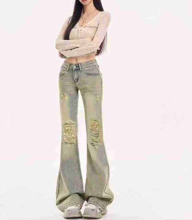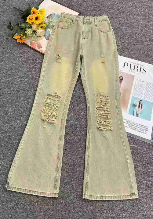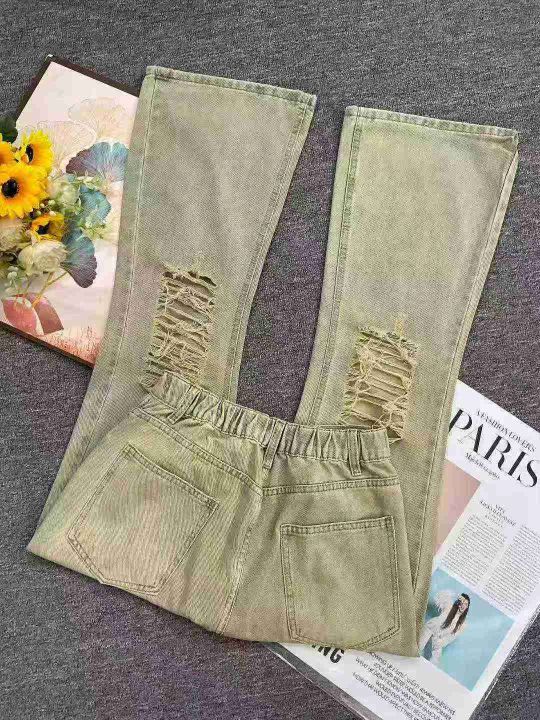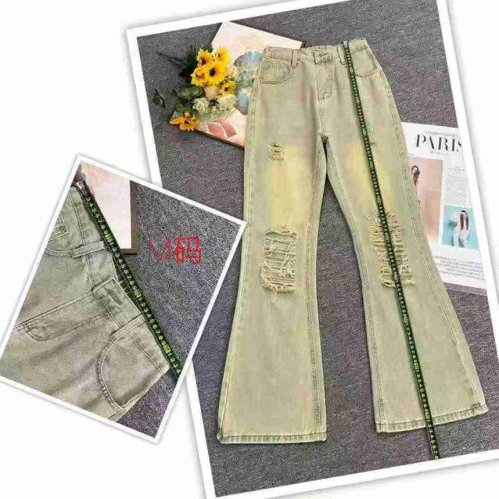 春秋新款复古泥巴色洗水棉微喇叭破洞牛仔裤,独立包装...