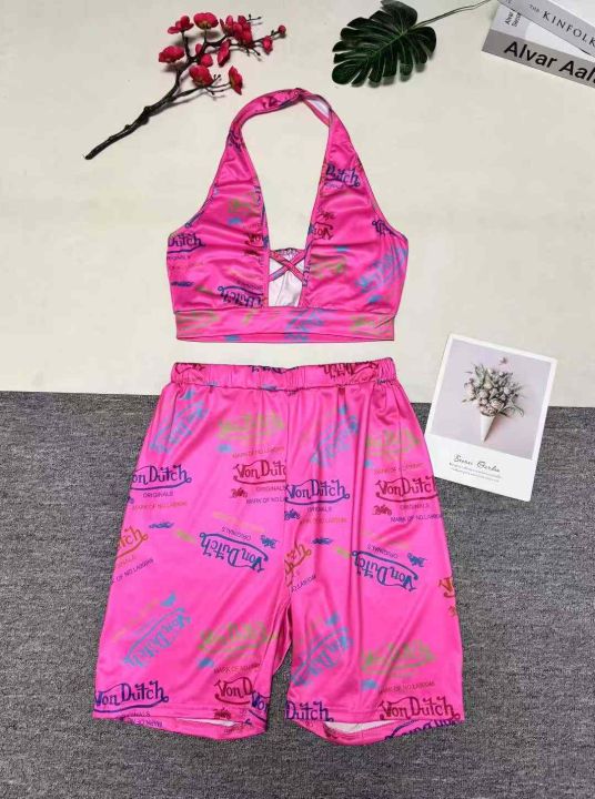 5.8清欧美时尚印花挂脖背心上衣短裤两件套 裤套装,整...