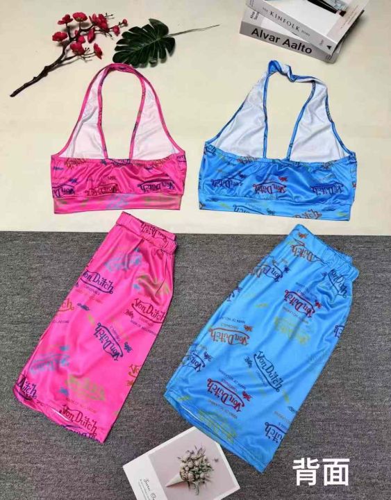欧美时尚印花挂脖背心上衣短裤两件套 裤套装,整款两色,数量110套,码数S-2XL,高弹力品质好,拉链式包装。