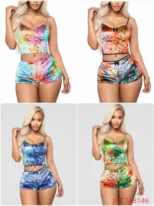 7.5清欧美时尚性感金丝绒扎染斑纹吊带短裤两件套,数量1000套左右,码数S-2...