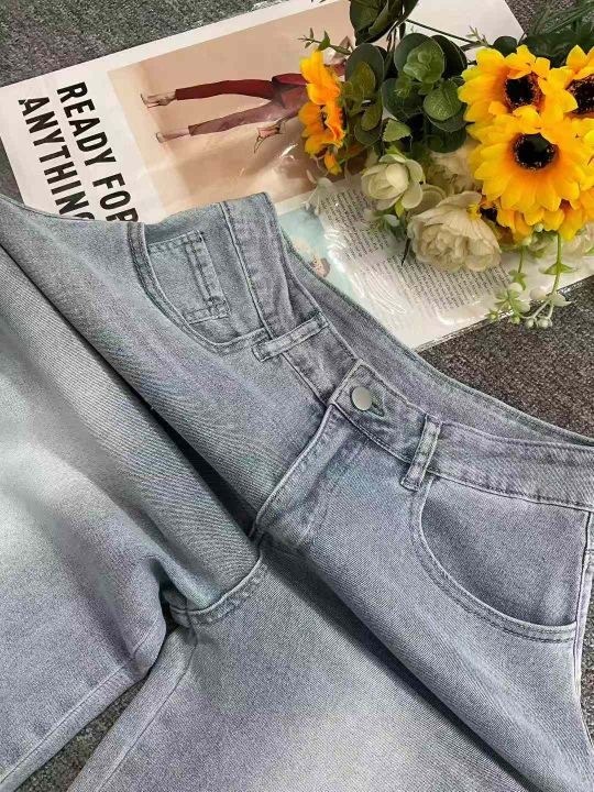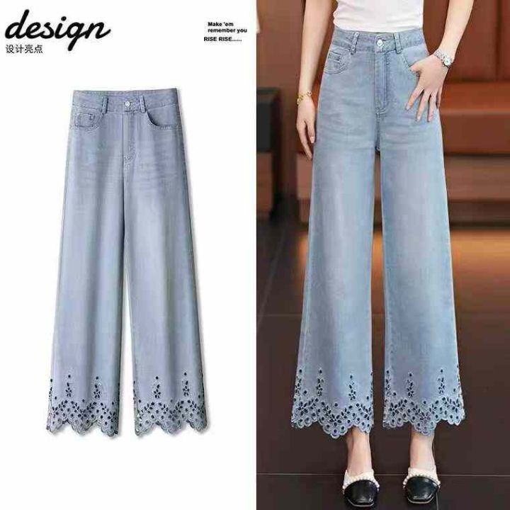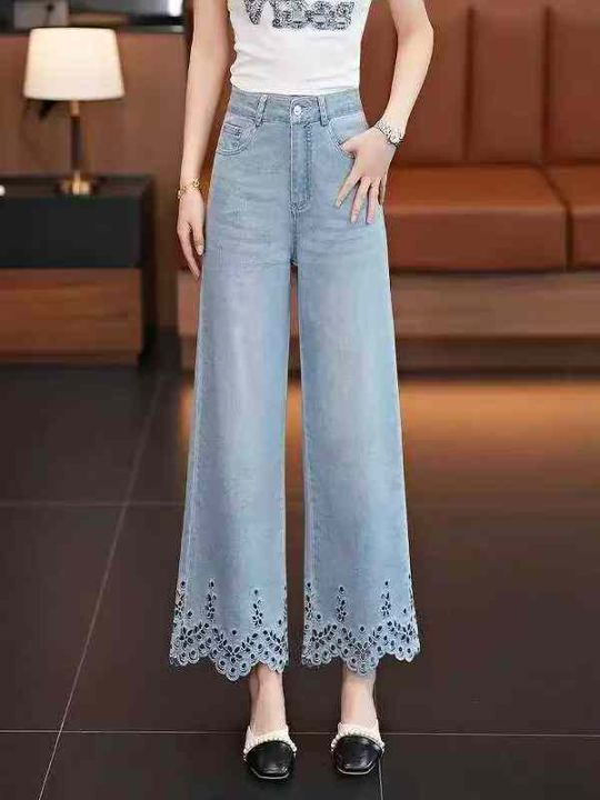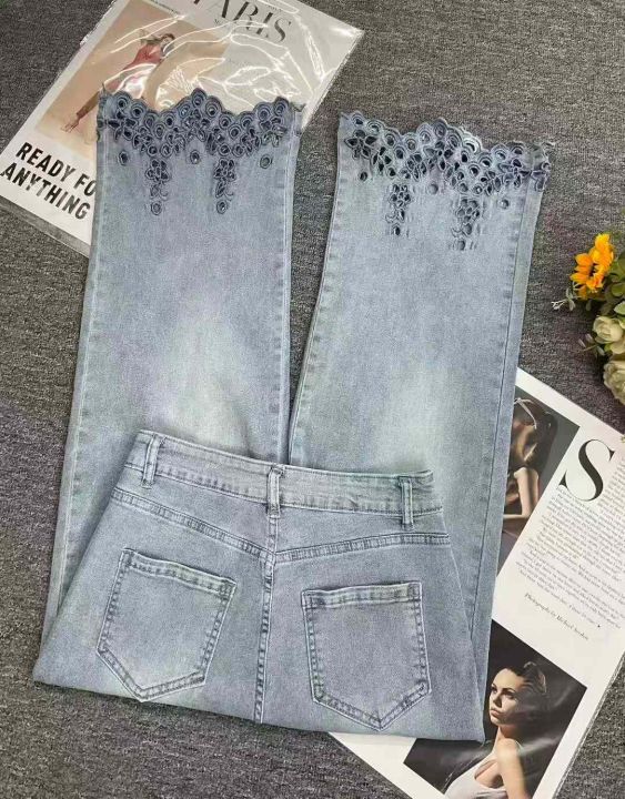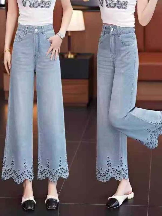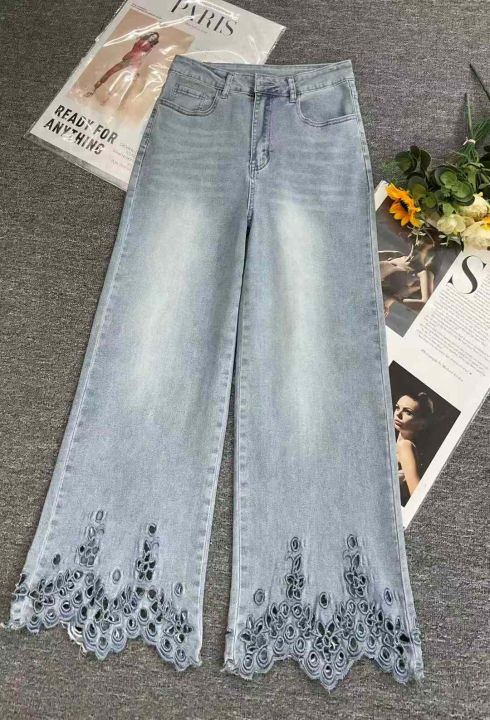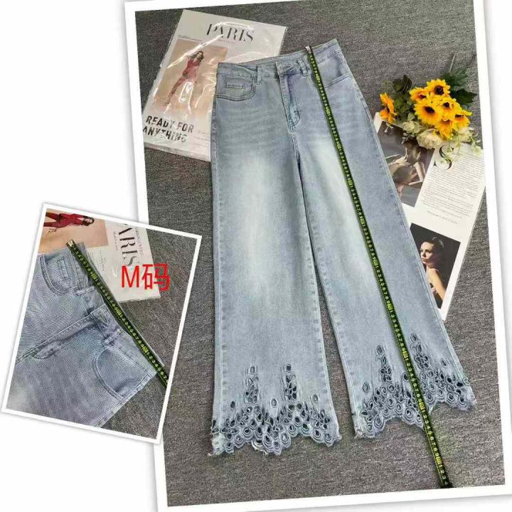 春夏新款高弹力洗水棉镂空设计感刺绣花边大码胖mm高腰阔腿牛仔裤,独立包装,码数S- 2XL码,175件,全清10.8元超低价秒杀!