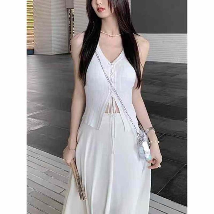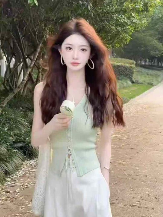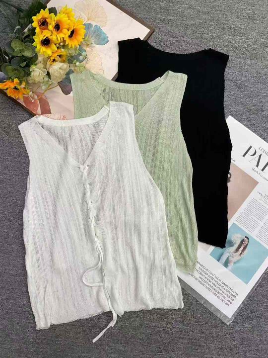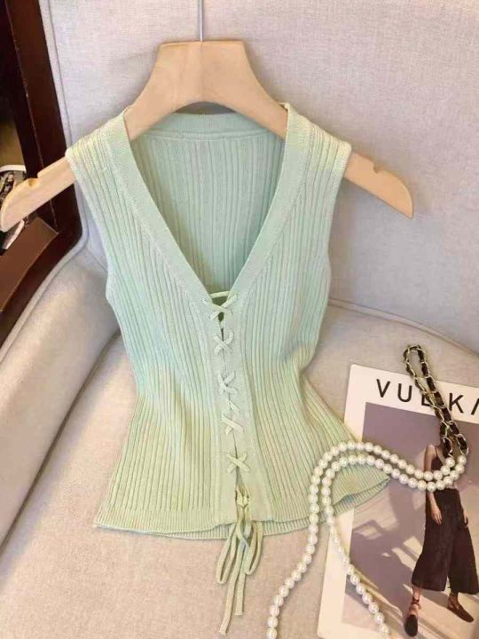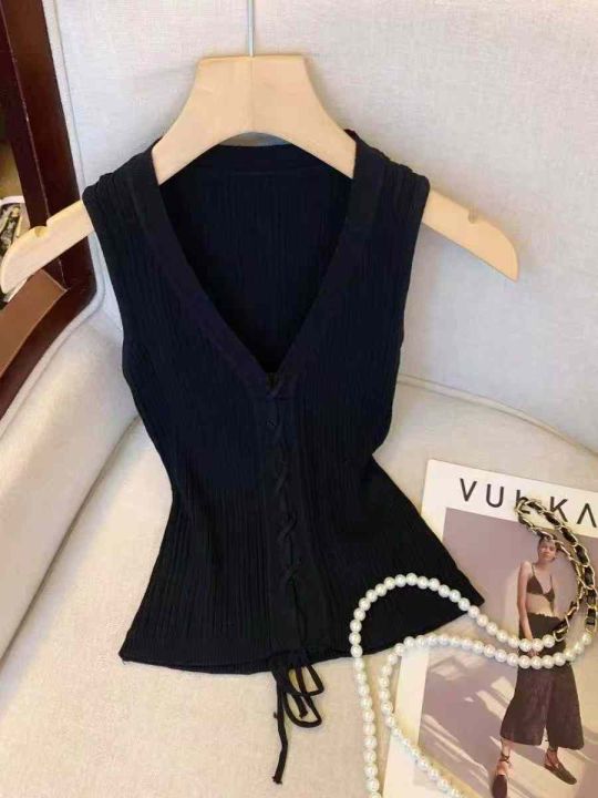 夏季新款设计感独特别致绑带薄款v领冰丝无袖针织衫,...