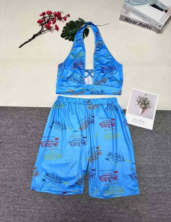 5.8清欧美时尚印花挂脖背心上衣短裤两件套 裤套装,整...
