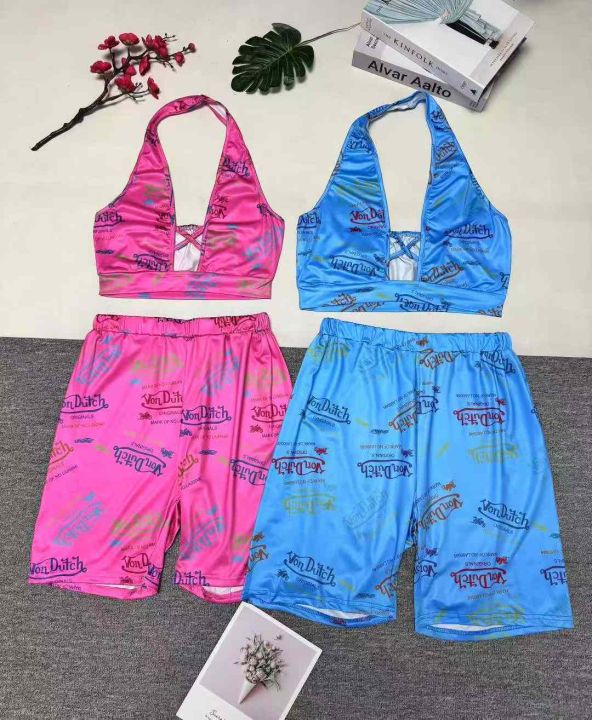 欧美时尚印花挂脖背心上衣短裤两件套 裤套装,整款两色,数量110套,码数S-2XL,高弹力品质好,拉链式包装。