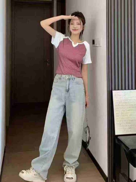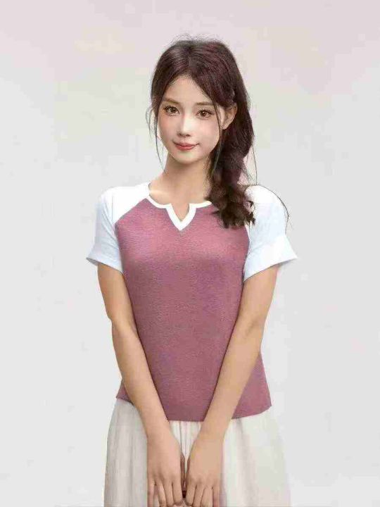 720多件辣妹撞色v领插肩袖时尚气质休闲百搭短袖t恤 ,...