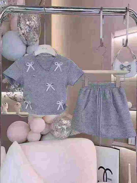 女童没计感时尚洋气蝴蝶结侧拉皱短袖加短裙两件套套装...