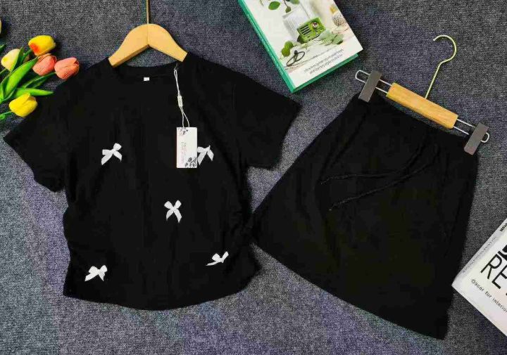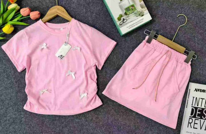 女童没计感时尚洋气蝴蝶结侧拉皱短袖加短裙两件套套装,85棉面料,335套,1-6码,独立包装,全清6.8元,分货+0.5