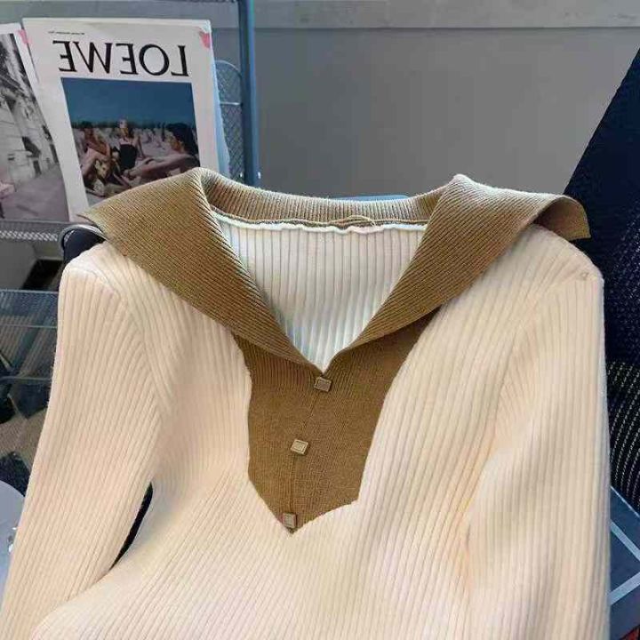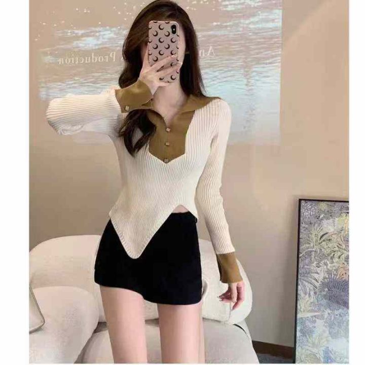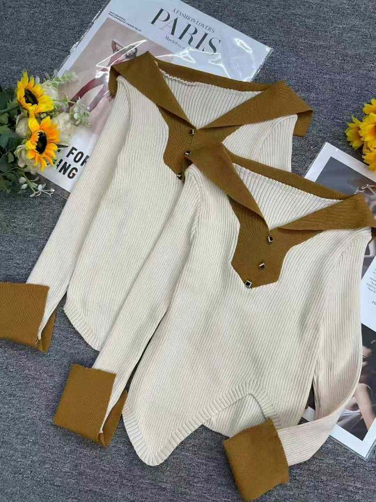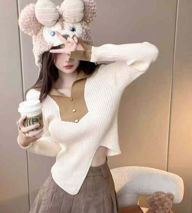 秋季新款纯欲甜辣妹polo领撞色不规则针织套头毛衣,独...