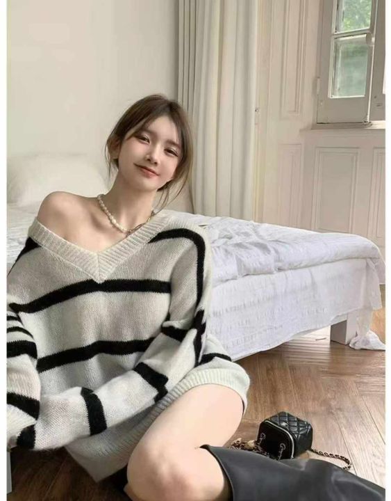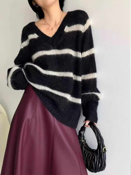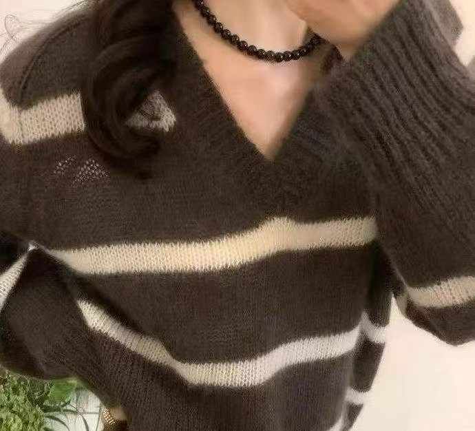 早秋新款复古日系宽松慵懒风v领撞色条纹马海毛套头毛...