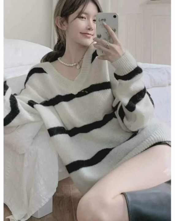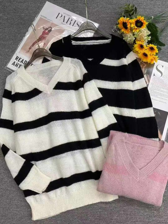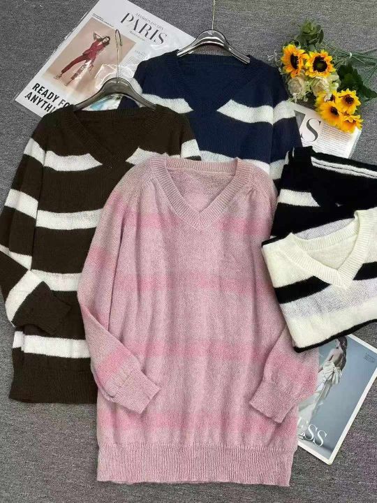 早秋新款复古日系宽松慵懒风v领撞色条纹马海毛套头毛衣,独立包装,均码大版型,321件,全清5.9元超低价秒杀!分货加一!