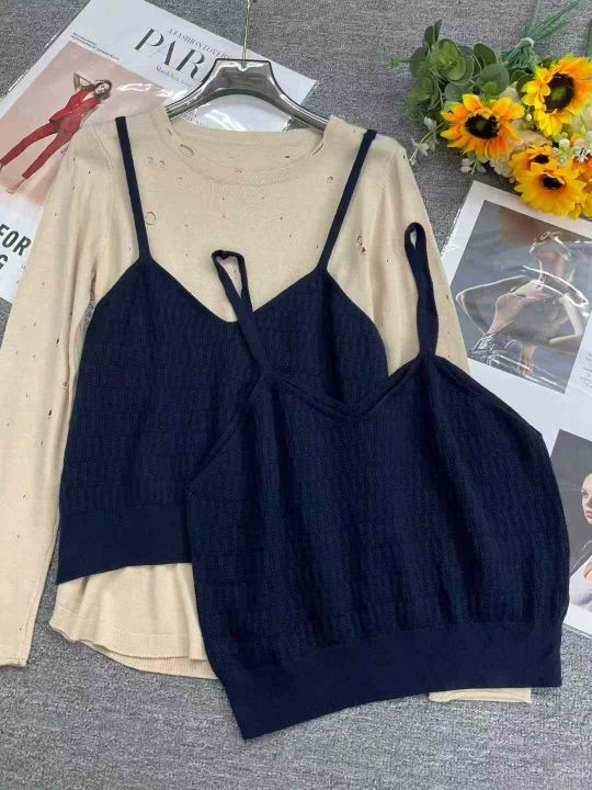 品牌原单女装早秋新款复古港风chic叠穿v领针织吊带背...