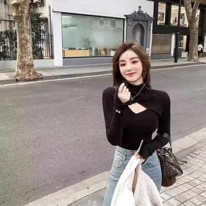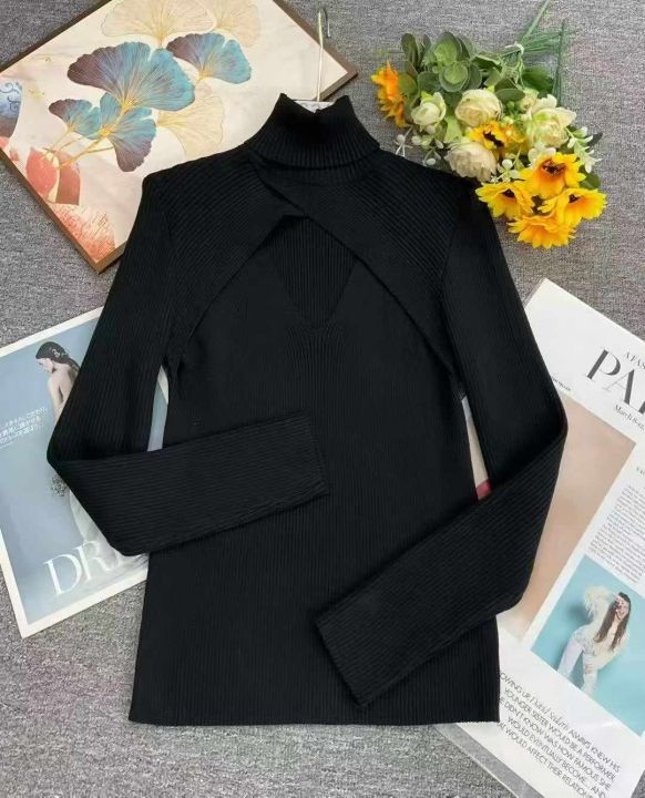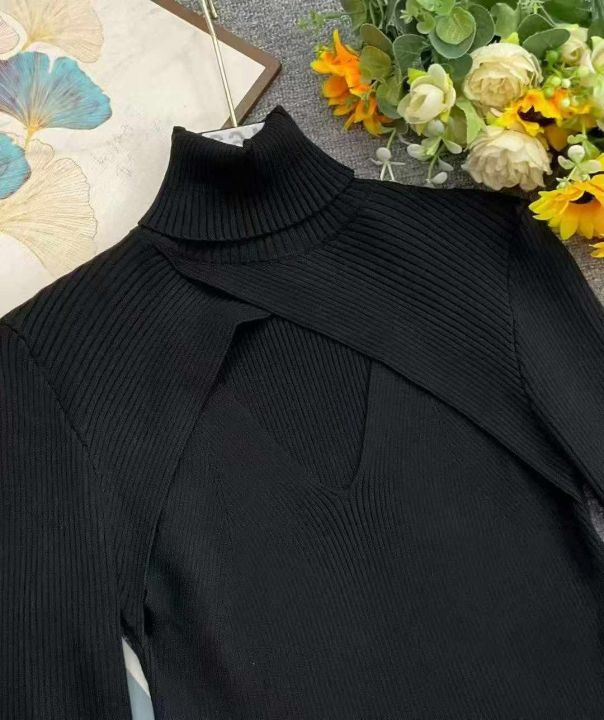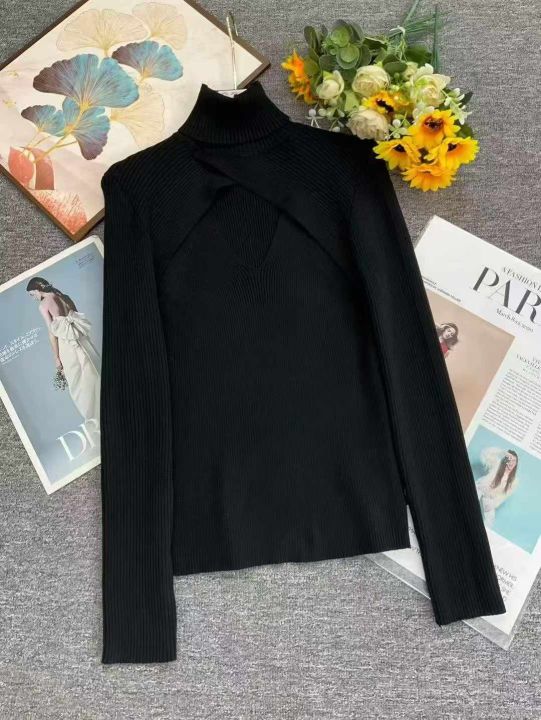 秋冬新款时尚百搭高领镂空设计款弹力修身套头毛衣,独...