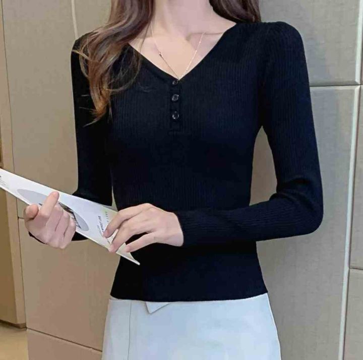 春秋修身纯色简约v领短款针织上衣,整款四色,高弹力...