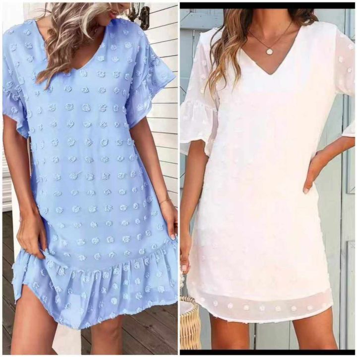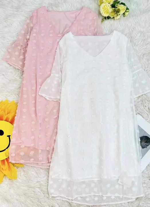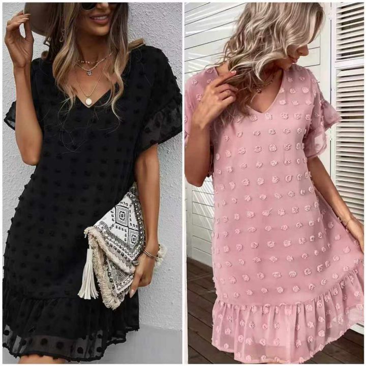 时尚波点提花套头宽松休闲女纯色V领连衣裙,风格经典复古优雅不过时[强],面料轻盈透气垂感显瘦,穿上舒适度满满,V领设计修饰效果强,A字版型隐藏大腿和胯部肉肉[机智],搭配省心且多变,性价比高[哇],分货9.9