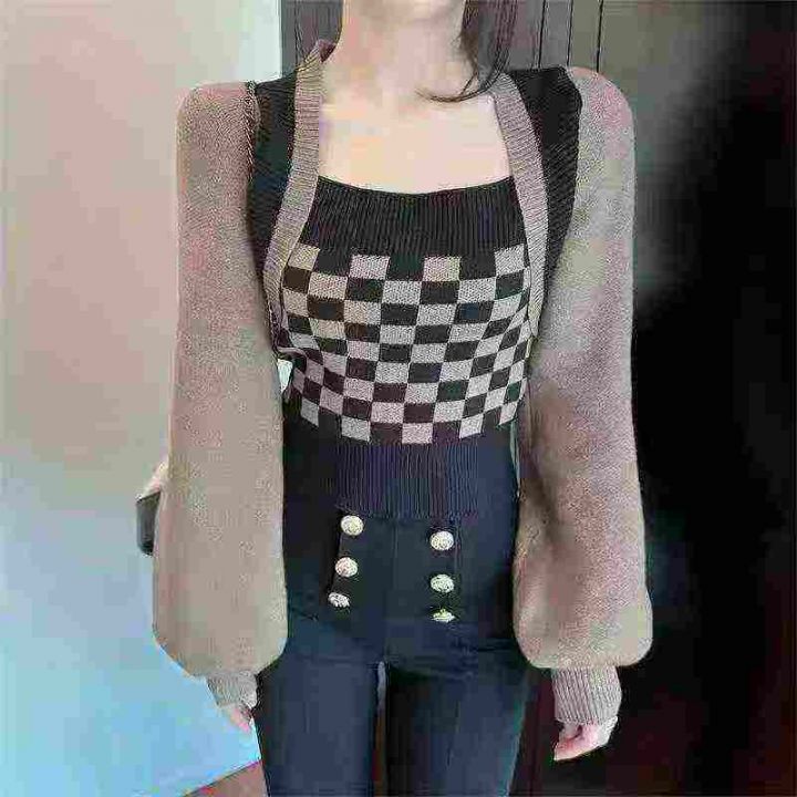春秋新款棋盘格别致假两件毛衣小众灯笼袖针织上衣,独立包装,均码,190件...