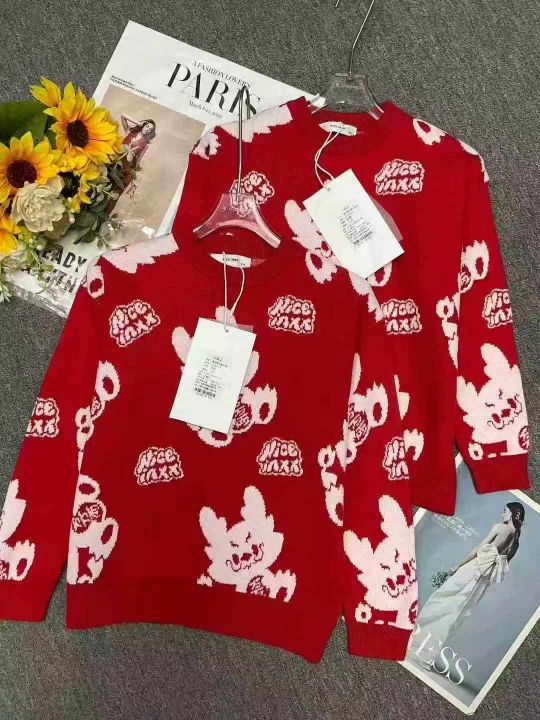 秋冬新款男女童中大童童装复古红色提花加厚包芯纱圆领套头毛衣,独立包装带...