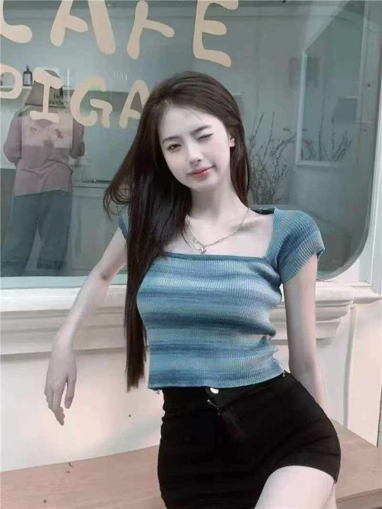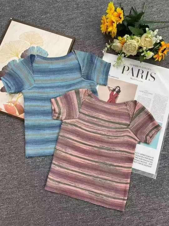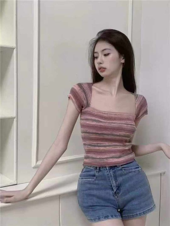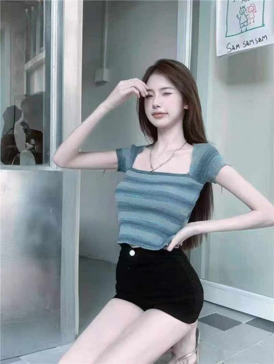 夏季新款方领撞色条纹简约复古文艺时尚减龄针织T桖,独立包装,均码面料软糯舒适弹力大,420件,全清5.9元超低价秒杀!分货加一!