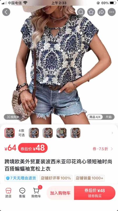 5.5元全清,跨境欧美外贸夏装波西米亚印花鸡心领短袖时尚百搭蝙蝠袖宽松上衣,独立包装,S-2XL,300件左右