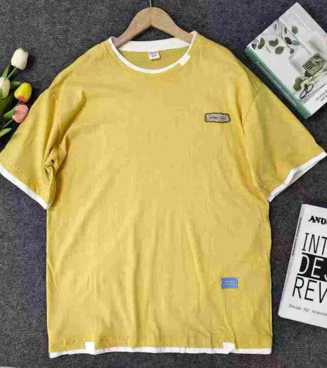 假两件宽松纯棉T恤,男港风潮流百搭痞帅落肩大板T,438件,M-5XL,黄色为主,后领包边过肩,独立包装,全清7.8元,分货+0.5