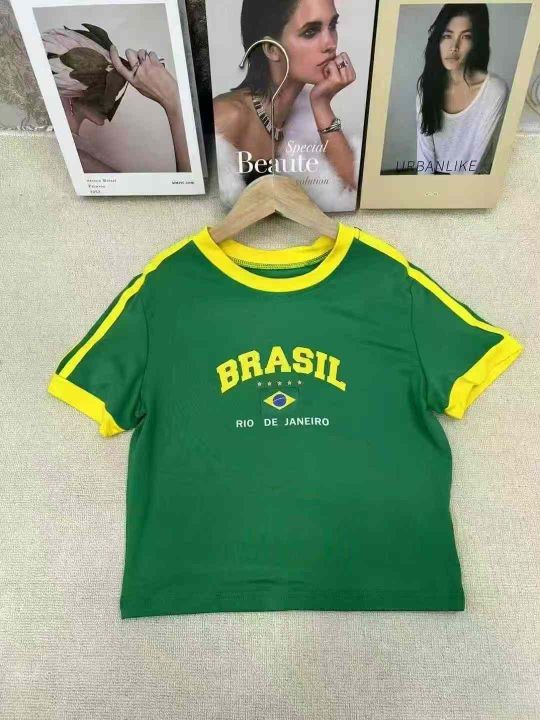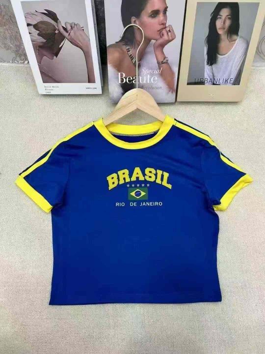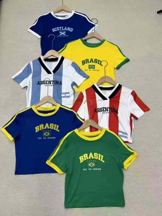 全球热销世界杯美式Y2K字母印花撞色拼接辣妹短T有包装...