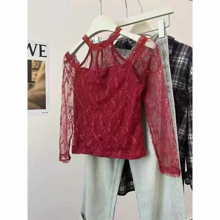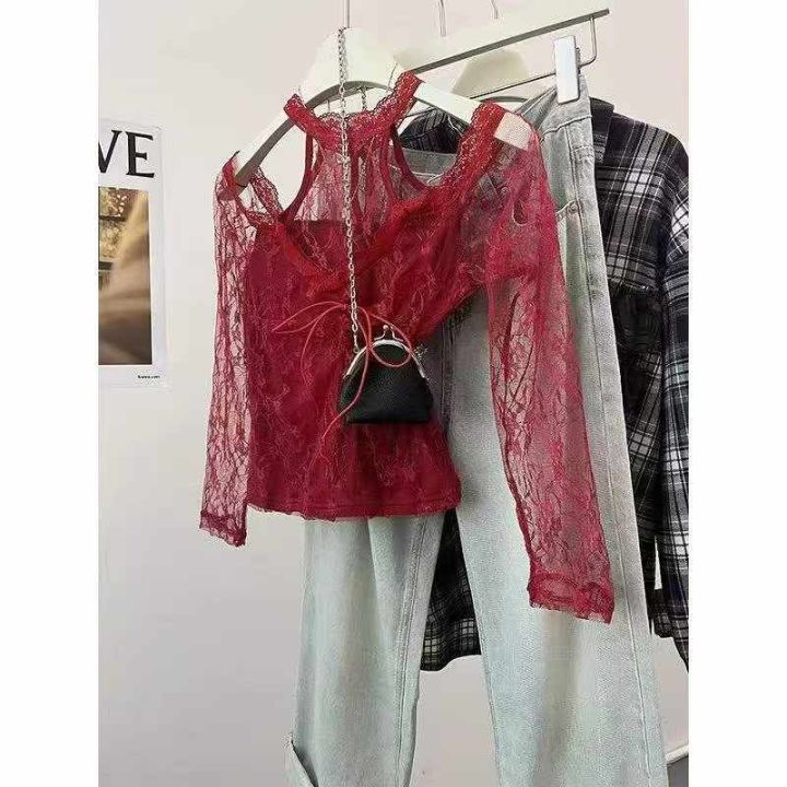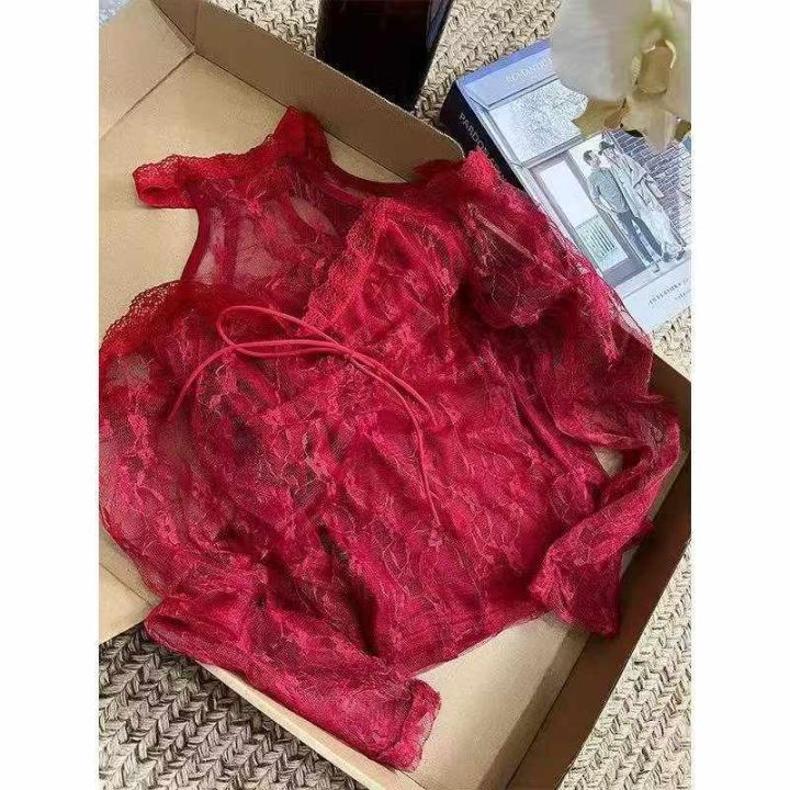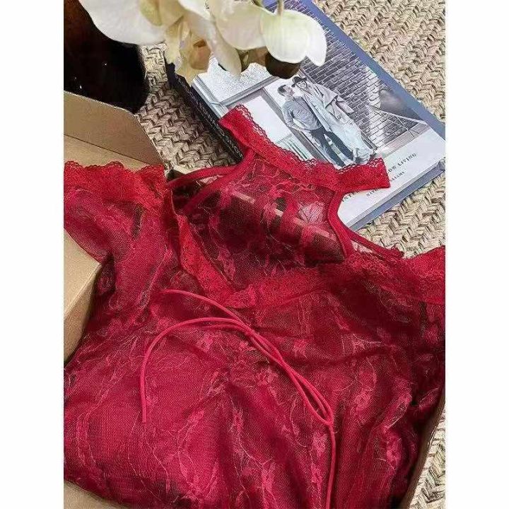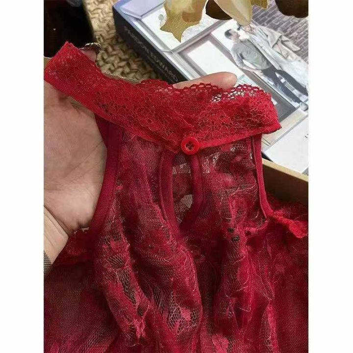 新款纯欲辣妹红色挂脖镂空蕾丝宫廷风修身上衣102件,...