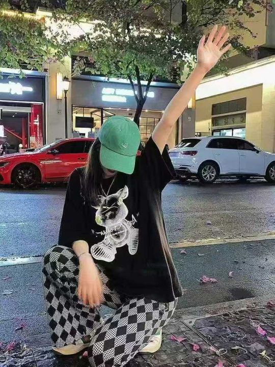 欧美外贸春夏宽松卡通兔子印花宽松阔腿裤可外穿宽松口袋长裤,只有黑色,独...