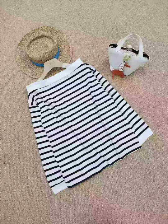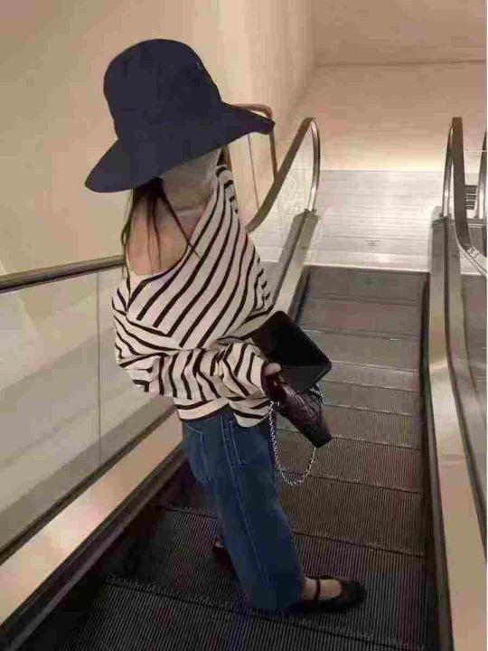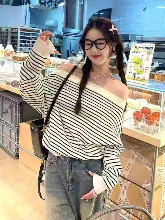 [月亮]:韩系辣妹条纹一字肩条纹长袖
