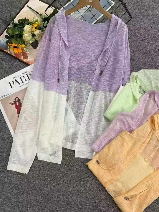 夏季新款韩系竹节麻百搭微透宽松连帽长袖防晒针织开衫...