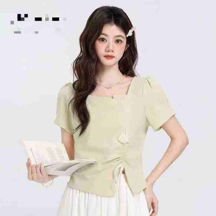 [月亮]:韩系甜美不规则褶皱抽绳上衣