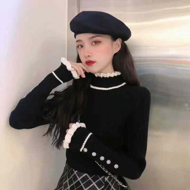 秋冬新款复古气质木耳边弹力修身显瘦套头毛衣,独立包装,均码面料软糯舒适...