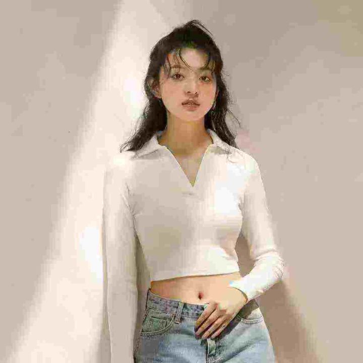 1200件美式复古辣妹polo领显瘦露脐紧身长袖T恤,尺码x...
