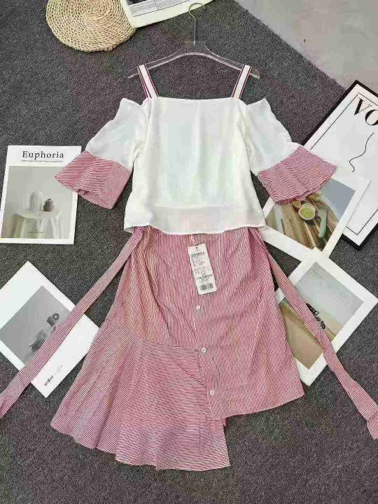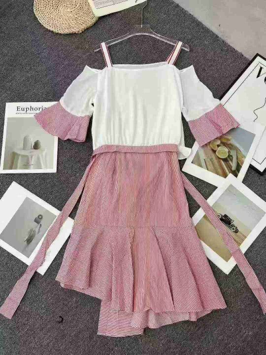 ☕️韩版小性感一字领露肩拼色吊带裙条纹短袖连衣裙337件全清12.5元分货13.5元,码数S到XXL,单款单色,独立包装[庆祝][庆祝][庆祝]