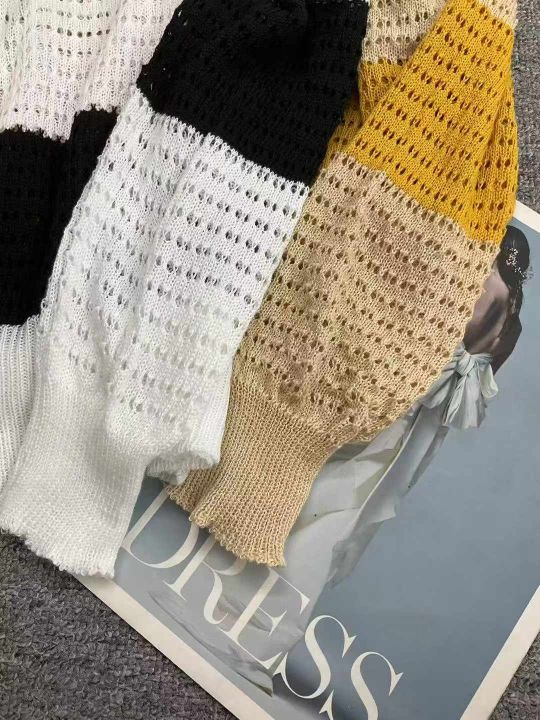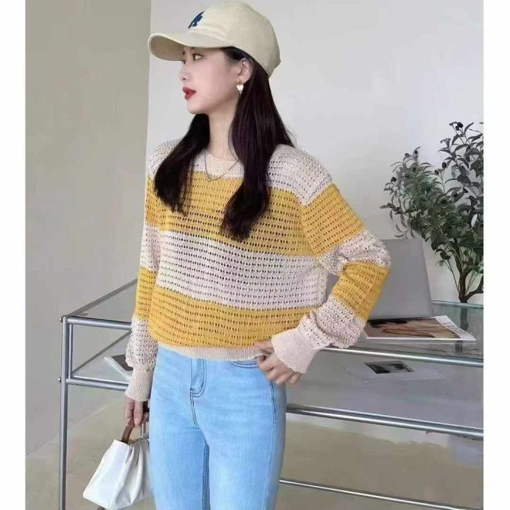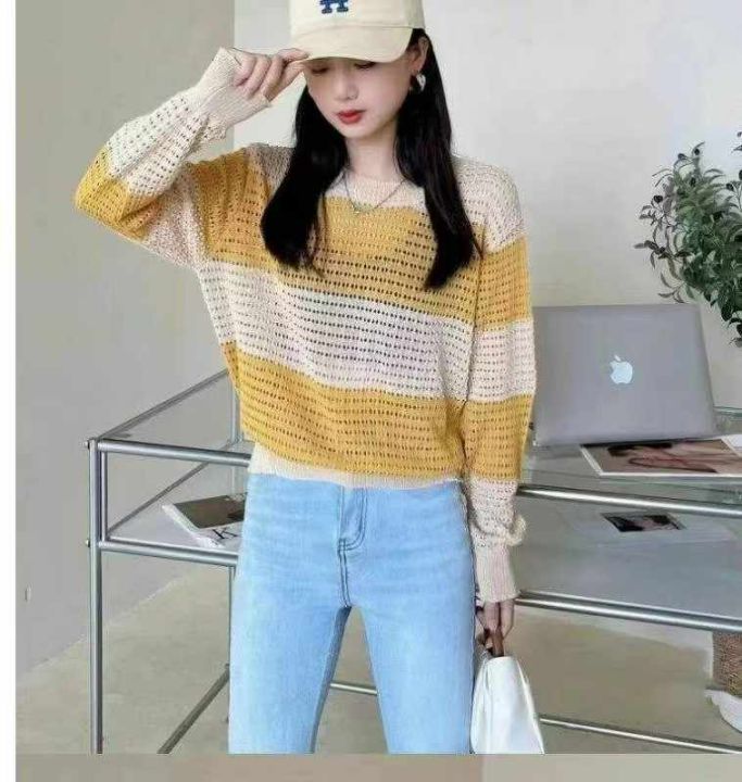 早秋新款女装韩版拼色宽松条纹长袖镂空衫针织衫,独立包装,均码面料柔软舒适透气,155件,全清5.9元超低价秒杀!