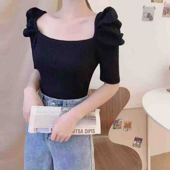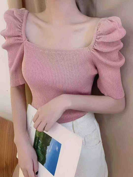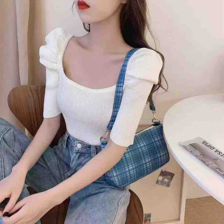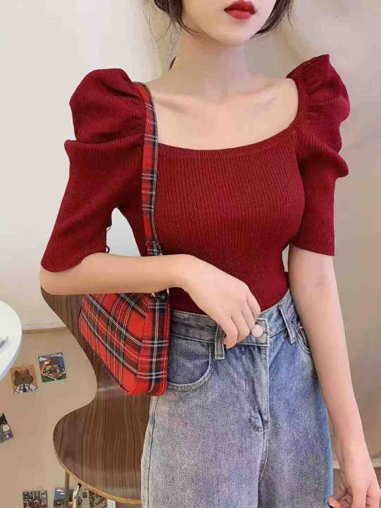 夏季新款复古法式方领泡泡袖锁骨冰丝针织短袖t恤,独...