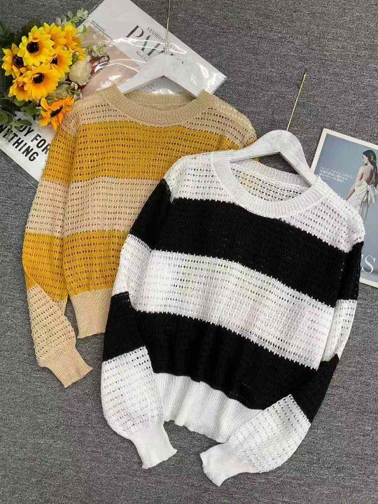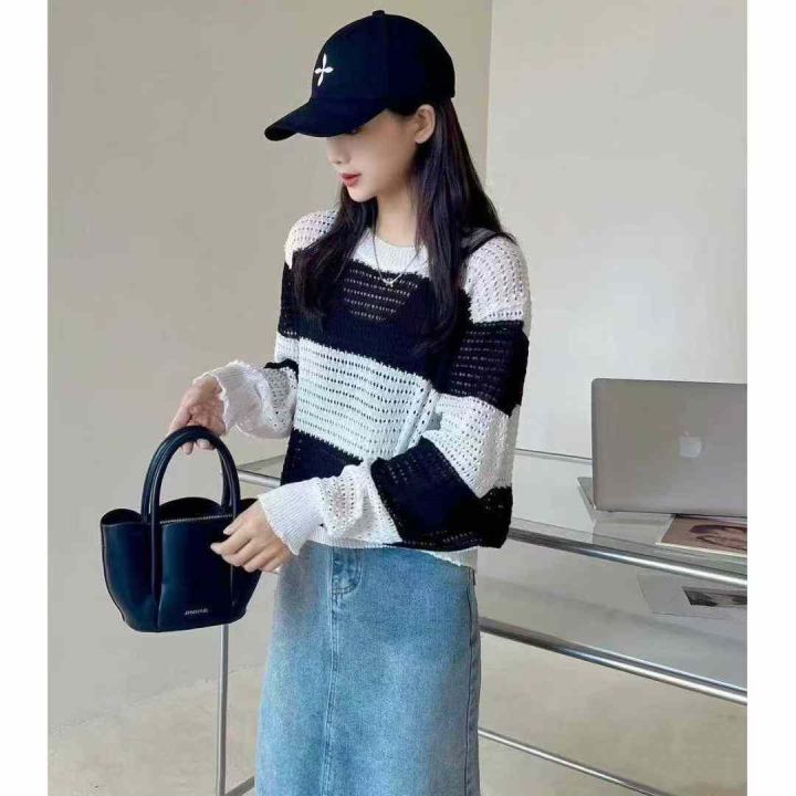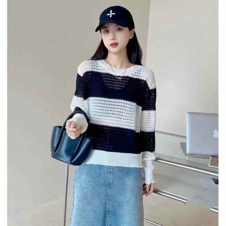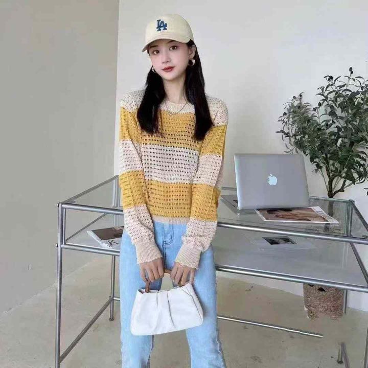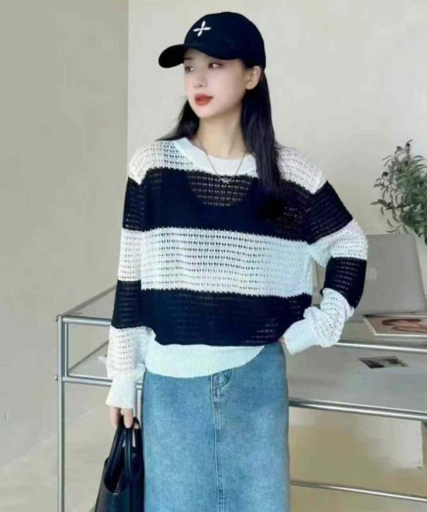 早秋新款女装韩版拼色宽松条纹长袖镂空衫针织衫,独立包装,均码面料柔软舒适透气,155件,全清5.9元超低价秒杀!