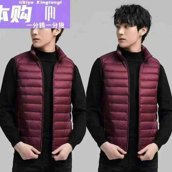 羽绒马甲男2025秋冬轻薄保暖大码短款宽松背心坎肩男装外套潮流时尚男羽绒马甲,大部分都是酒红色,另外两个色(蓝,正红)少,内里白鸭绒舒适保暖,袖口下摆松紧设计,牢牢锁温[666],不挑人不紧绷,口袋拉链设计,送收纳袋,防便 携带[强],✅性价比直接拉满,100件起分货26.8