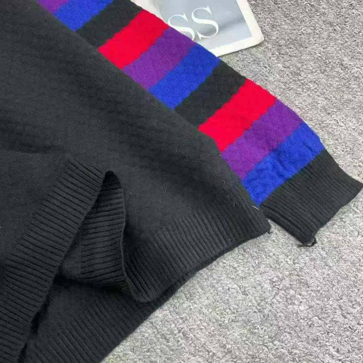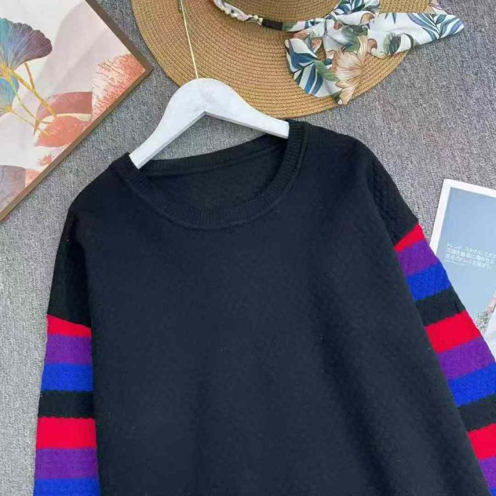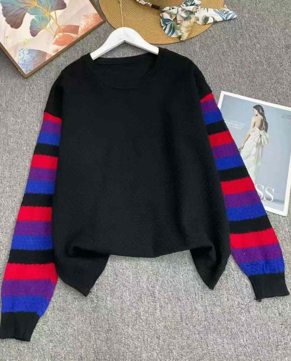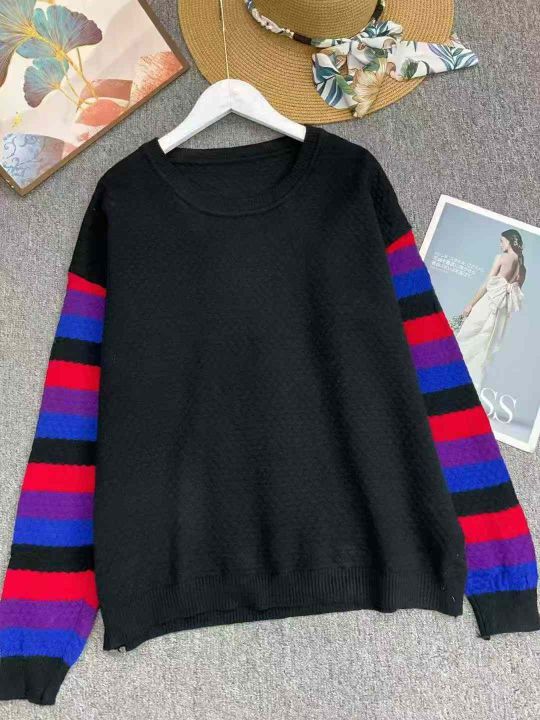 春季复古设计款彩色条纹袖宽松慵懒风包芯纱套头毛衣,...