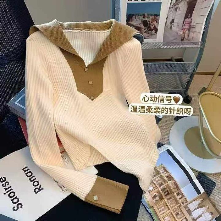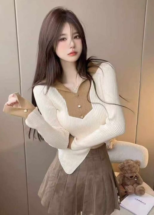 秋季新款纯欲甜辣妹polo领撞色不规则针织套头毛衣,独...