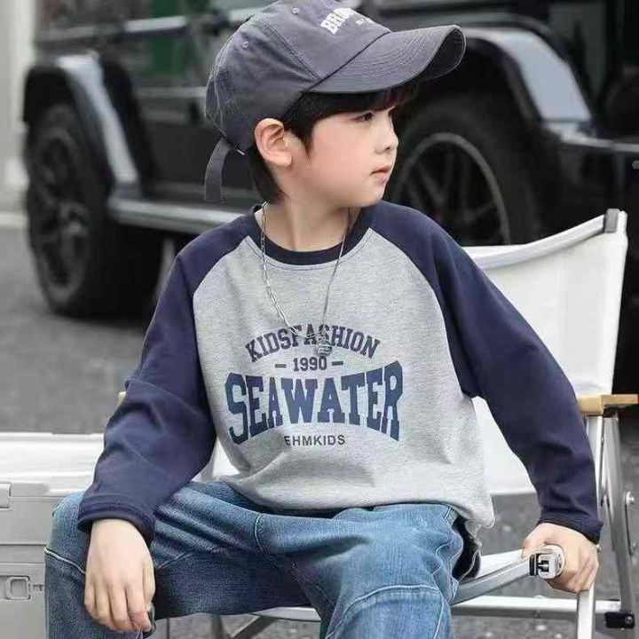 纯棉男童长袖拼接款t恤秋款春季新款撞色袖插肩袖中大...