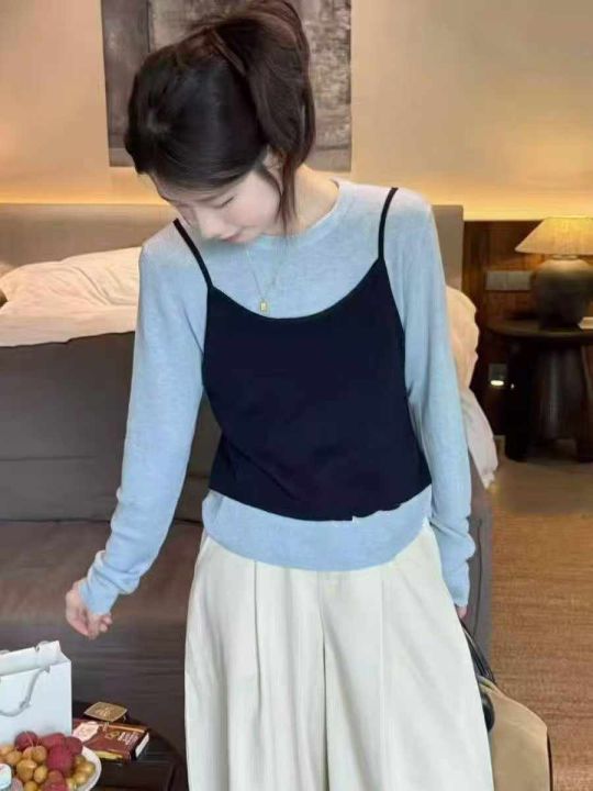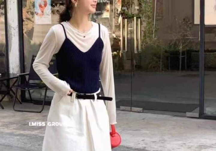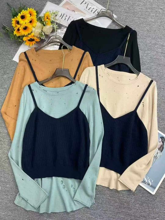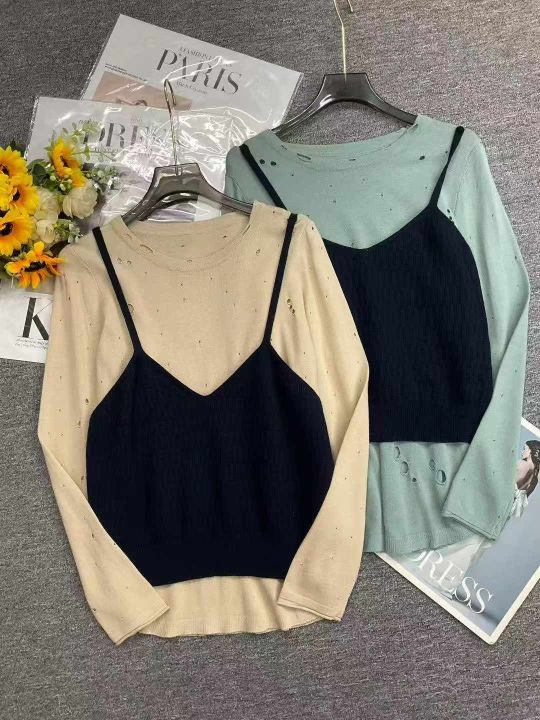 品牌原单女装早秋新款复古港风chic叠穿v领针织吊带背心马甲+设计款镂空针织长袖上衣2件套, 独立包装,面料软糯舒适弹力大,310套,全清7.9元超低价秒杀!