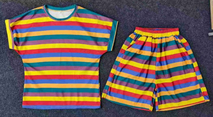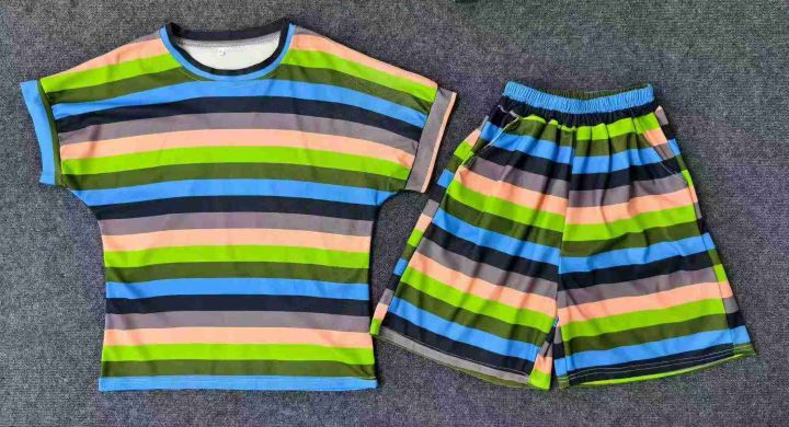 女中大童夏季时尚彩条T恤短裤套装,珠地网眼面料,216套,2-7码,独立包装,全清7.8元