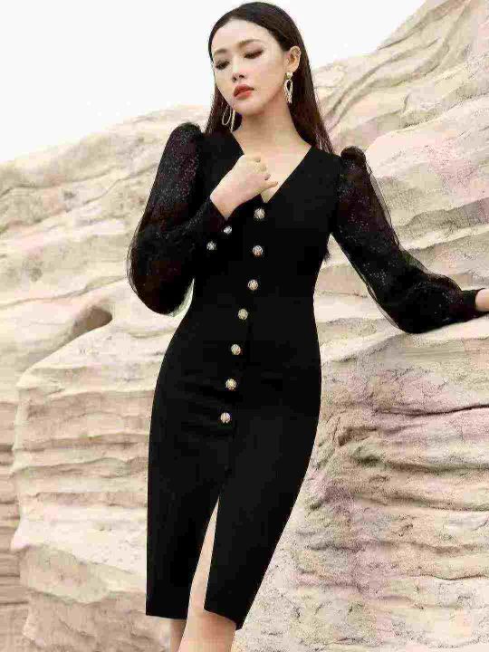130件左右春秋新款气质黑色设计感泡泡袖V领修身中长款...