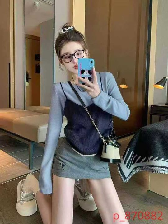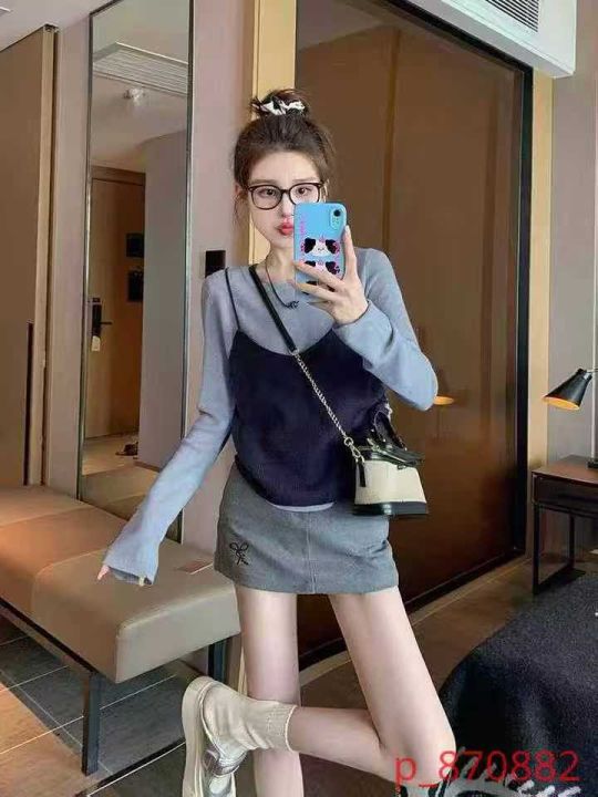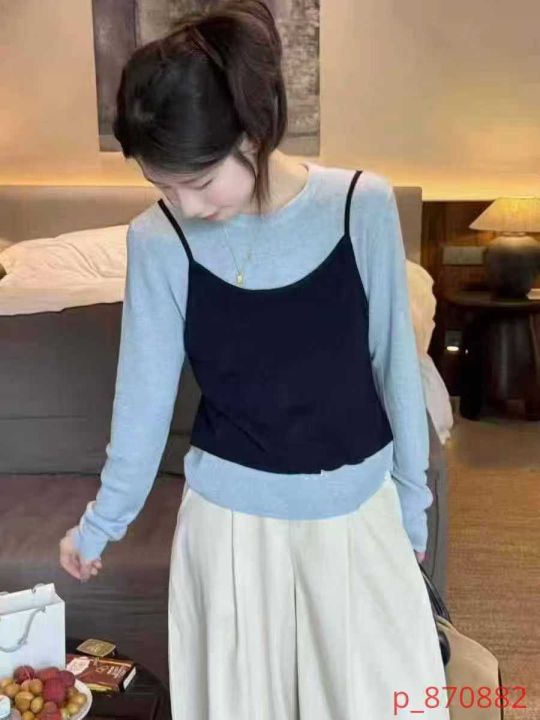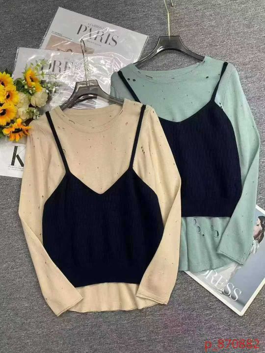 品牌原单女装早秋新款复古港风chic叠穿v领针织吊带背心马甲+设计款镂空针织长袖上衣2件套, 独立包装,面料软糯舒适弹力大,310套,全清7.9元超低价秒杀! _@_@
