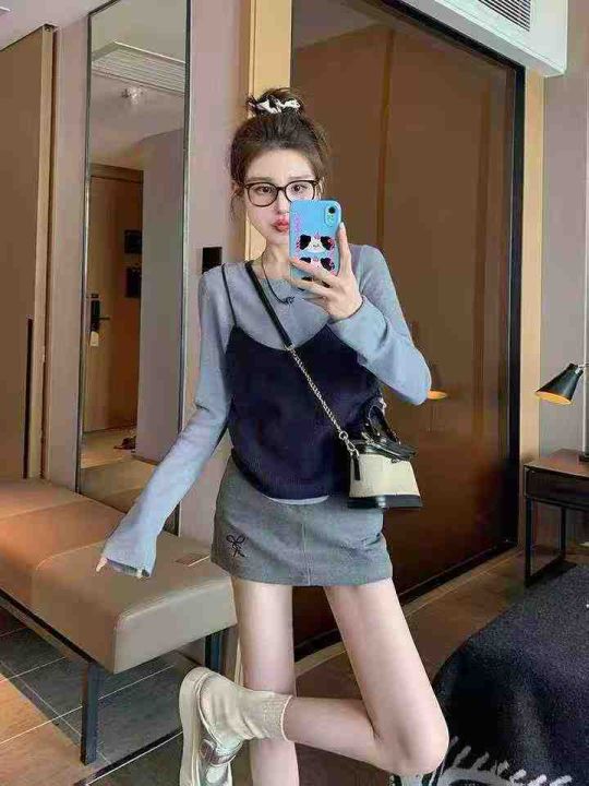 品牌原单女装早秋新款复古港风chic叠穿v领针织吊带背心马甲+设计款镂空针织长袖上衣2件套, 独立包装,面料软糯舒适弹力大,310套,全清7.9元超低价秒杀!