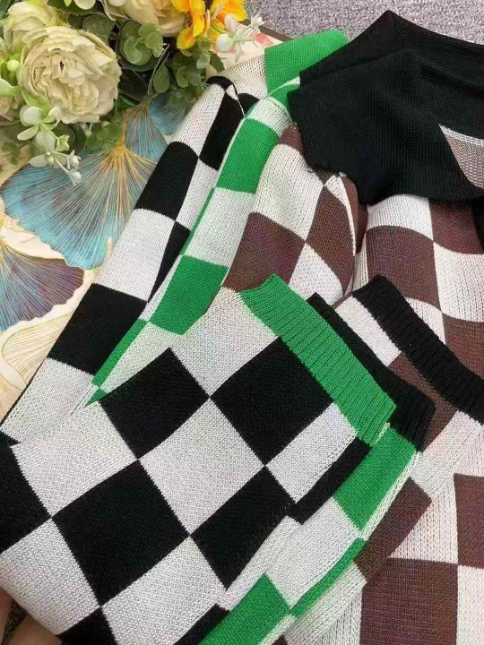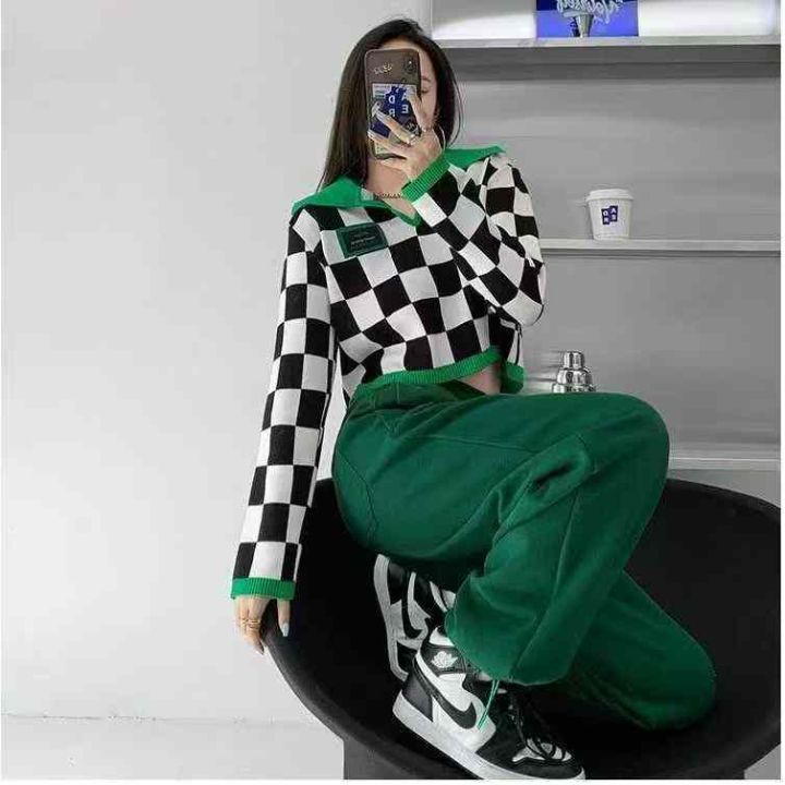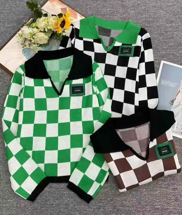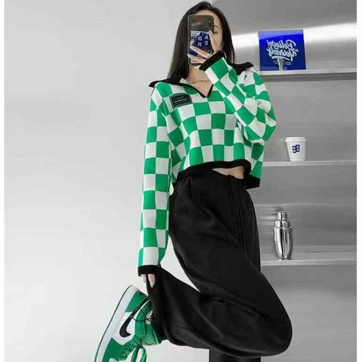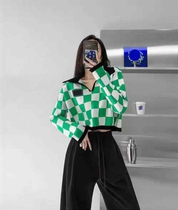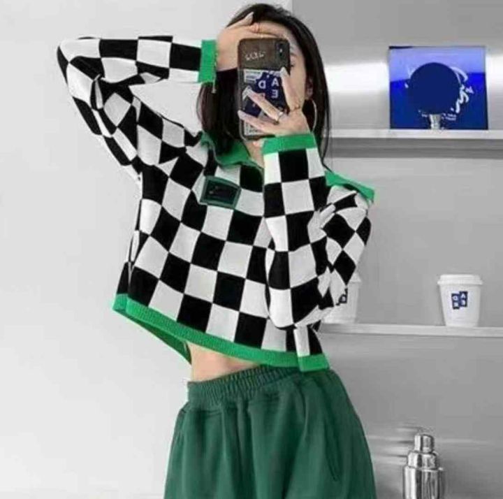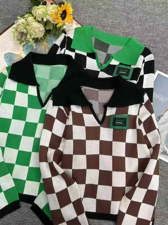 春季新款美式复古棋盘格拼色Polo领设计感贴标长袖套头毛衣,独立包装,短款宽松款,面料柔软舒适,312件,全清5.9元超低价秒杀!分货加一!
