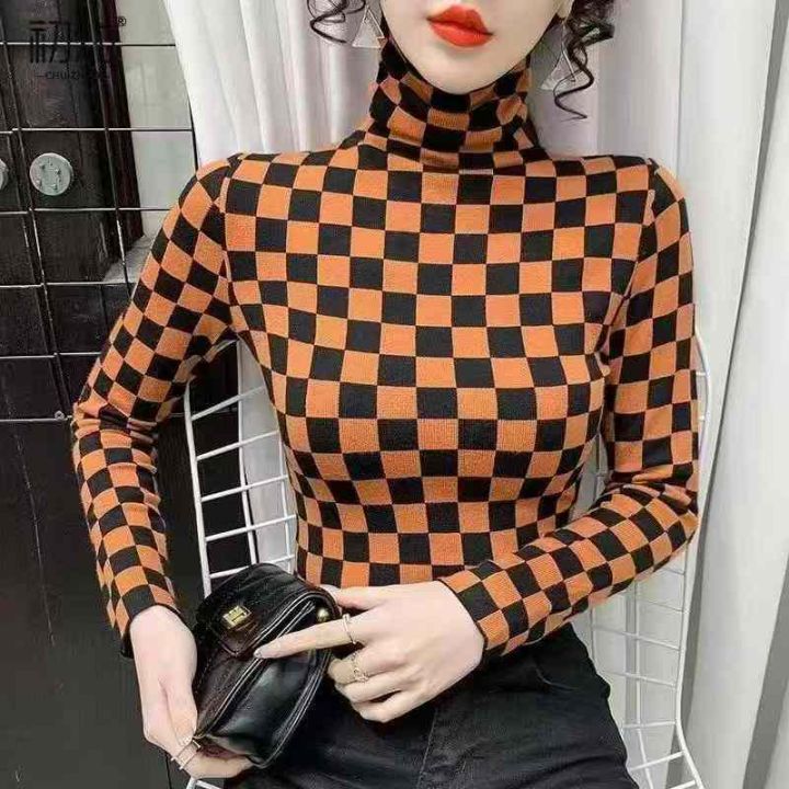 秋冬新款高品质欧洲站复古棋盘格拼色高领弹力修身显瘦...