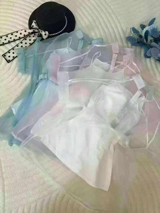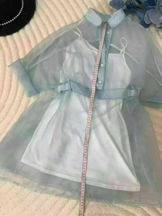 【两件套】镂空薄纱短裙收腰甜美两件套吊带衫欧根纱连衣裙上衣