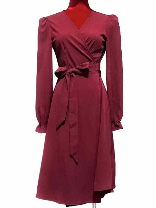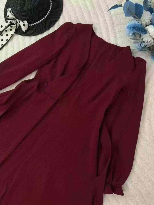 纯色裹胸款春秋季衩领束带灯笼袖长袖连衣裙