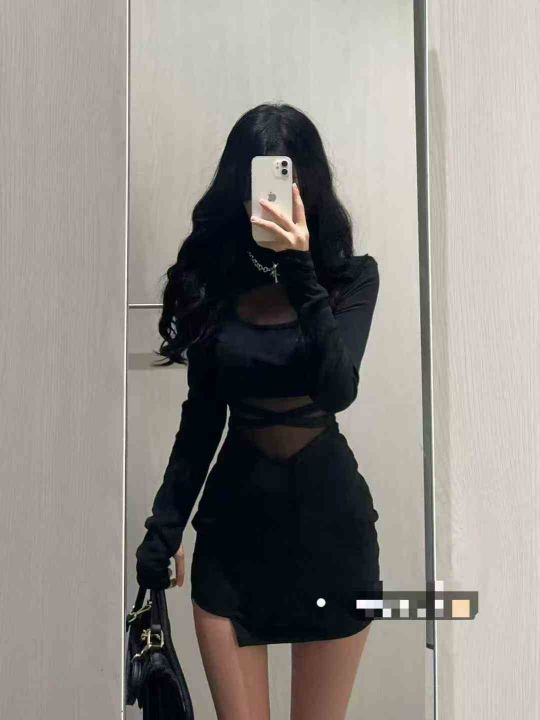 [月亮]:网纱拼接德绒辣妹长袖连衣裙