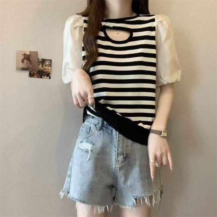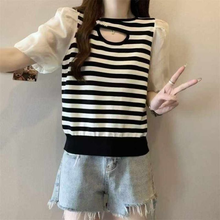 夏季新款新中式国风盘扣拼接泡泡袖条纹针织短袖,独立...